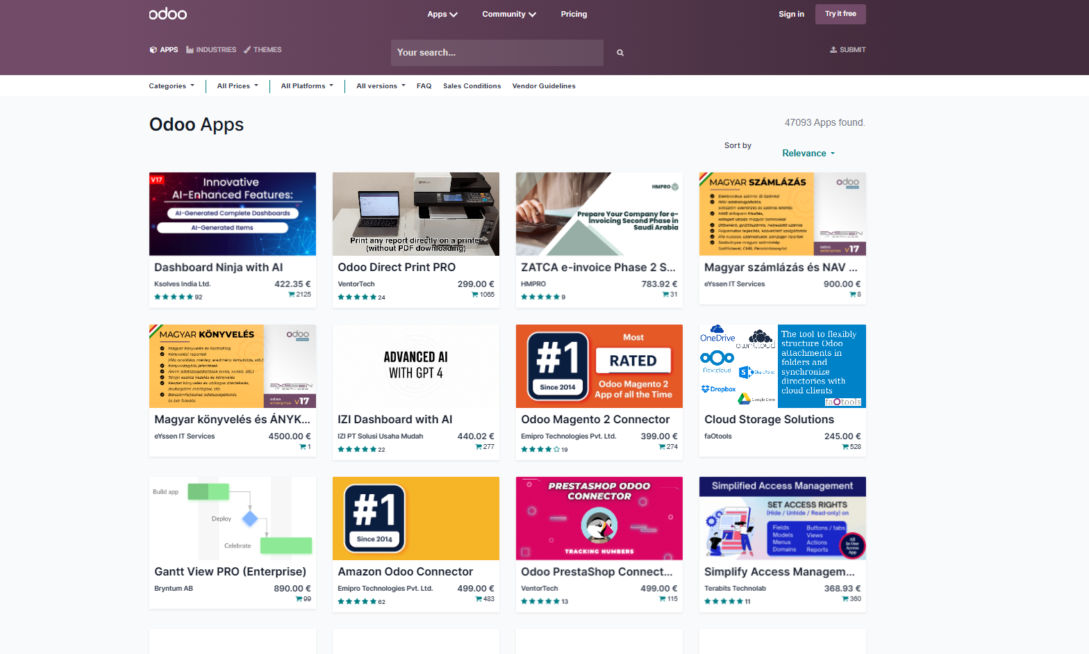 Odoo-AppStoren etusivu huokuu runsautta:
